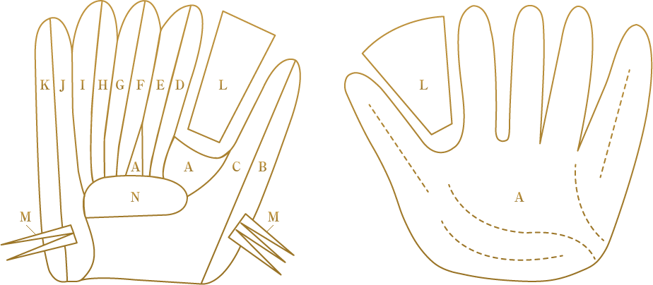 (高校野球の投手用・野手用、大学野球・社会人野球の投手用は革の自然色または玉ハミの場合は本体色のみ使用可能です)